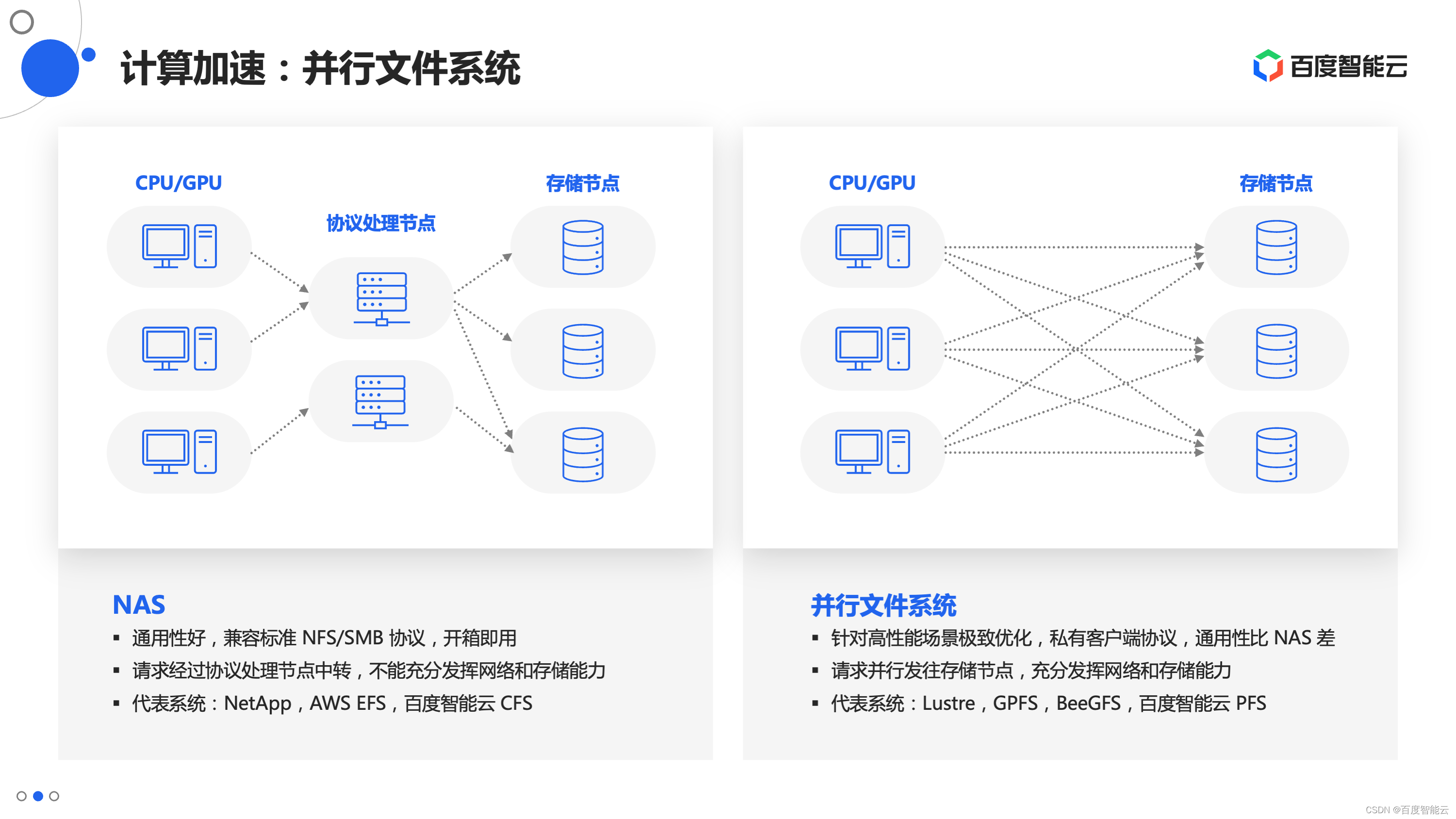 第二类系统是并行文件系统。并行文件系统走了和 NAS 相反的路线,专门针对特定的高性能场景去做一些极致的优化。这类系统通常会放弃或弱化对标准协议的兼容性,取而代之,实现私有的客户端协议,通常运行在内核态。业务的请求进入客户端后,迅速、直接发往后端的存储节点。这种设计让软件上的 I/O 路径达到最短,充分利用后端节点、设备的并行处理能力。这类系统的代表有 Lustre、BeeGFS、GPFS,和百度智能云PFS。