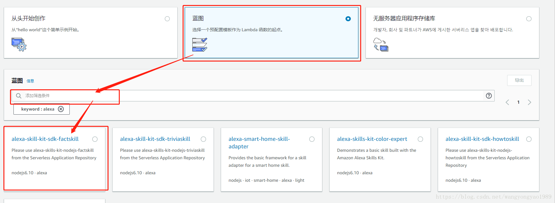 8.选择蓝图——>搜索栏输入alexa查找到alexa-skill-kit-sdk-factskill的技能模板——>配置: