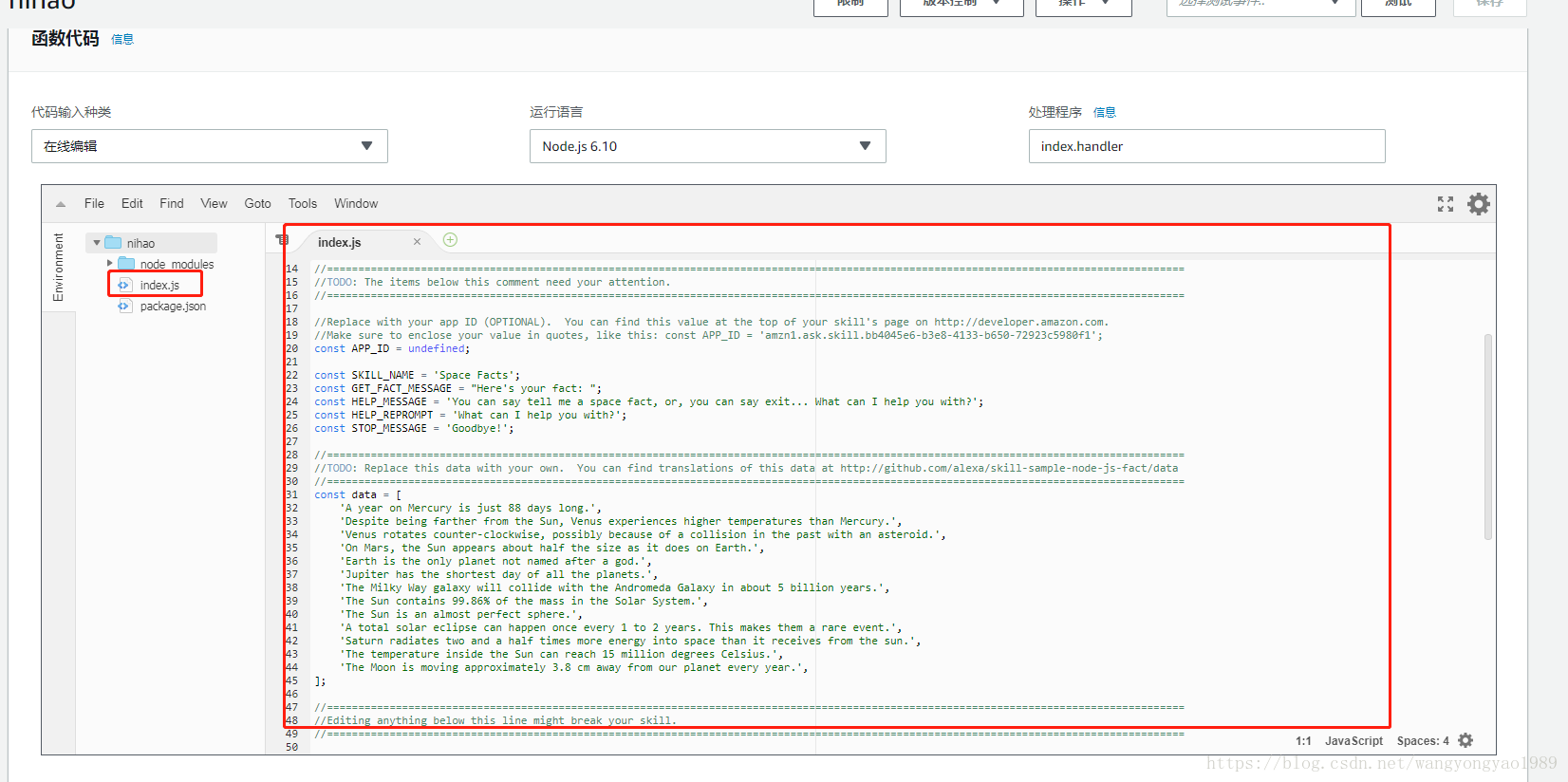 12.把上面的函数代码中的index.js代码清除,填入如下代码:
