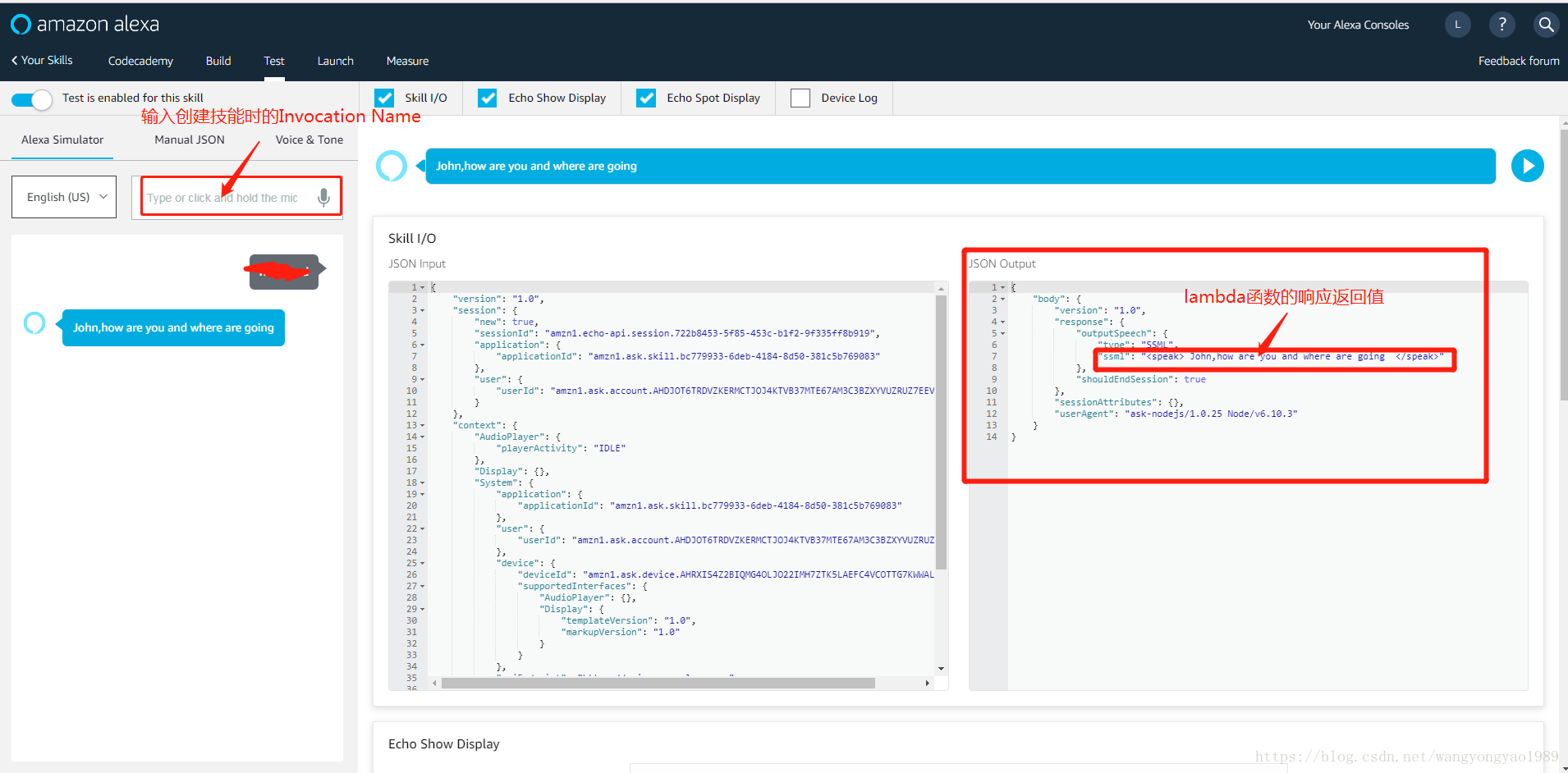 15.下一步是控制台上的TEST,输入创建技能时的Invocation Name,到此一个技能创建和测试就完成了: