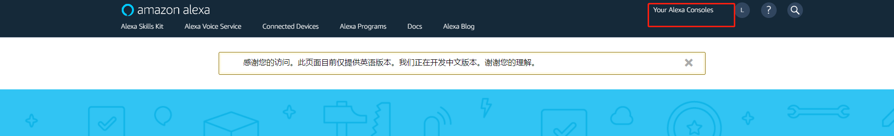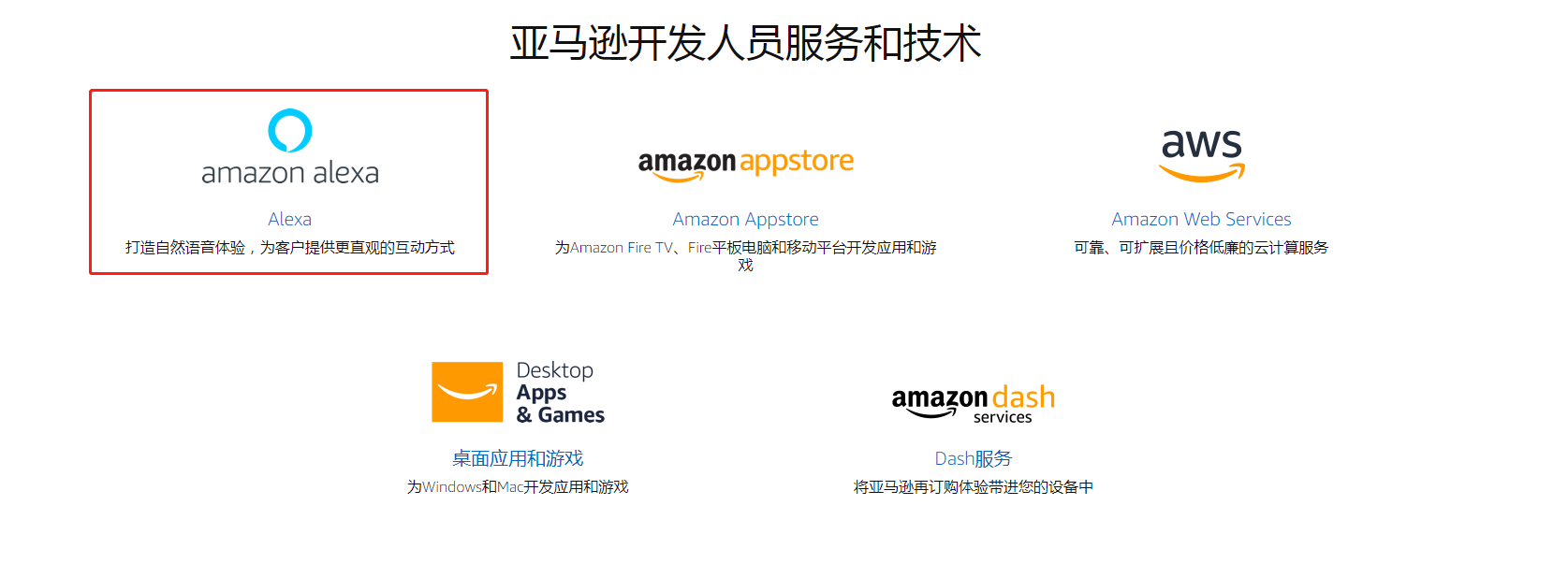 1.Alexa技能的开发首先需要一个亚马逊的开发者账号https://developer.amazon.com 如下进入Amazon Alexa: