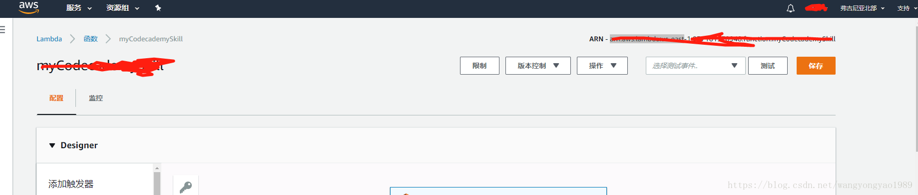 13.之后保存设置——>拷贝Lambda中ARN:arn:aws:lambda:us-east......