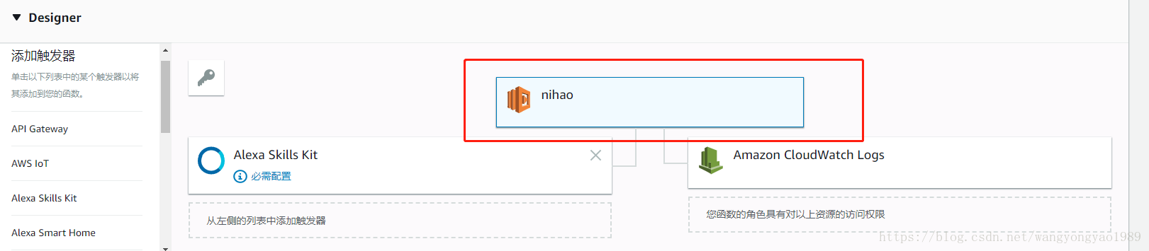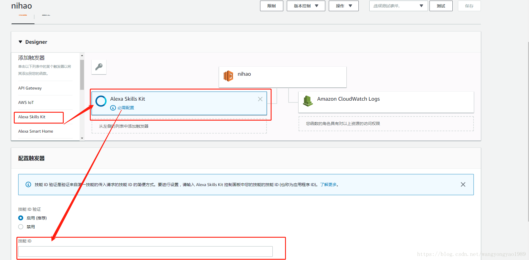10.添加触发器“Alexa Skills Kit”把步骤5中“Your Sills ID”的值拷贝到技能ID中: