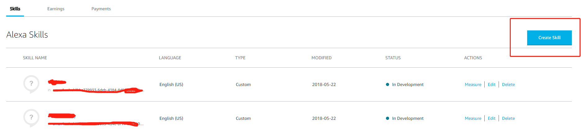 3.进入Alexa技能的创建界面 --> "Craete Skills"创建自己的技能: