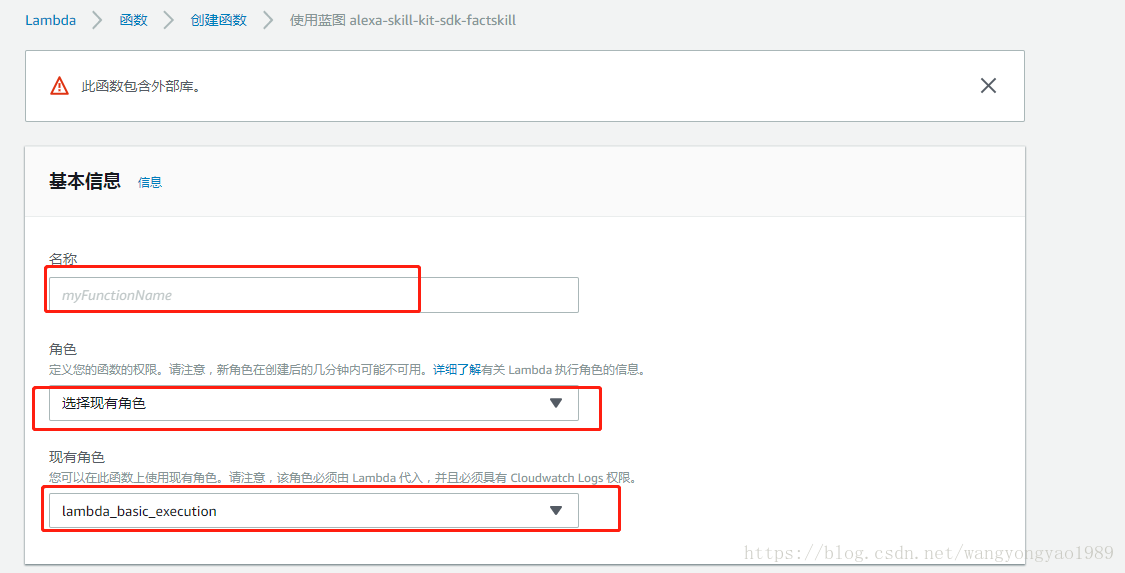 9.写入名称、选择角色、选择:lambda_basic_execution: