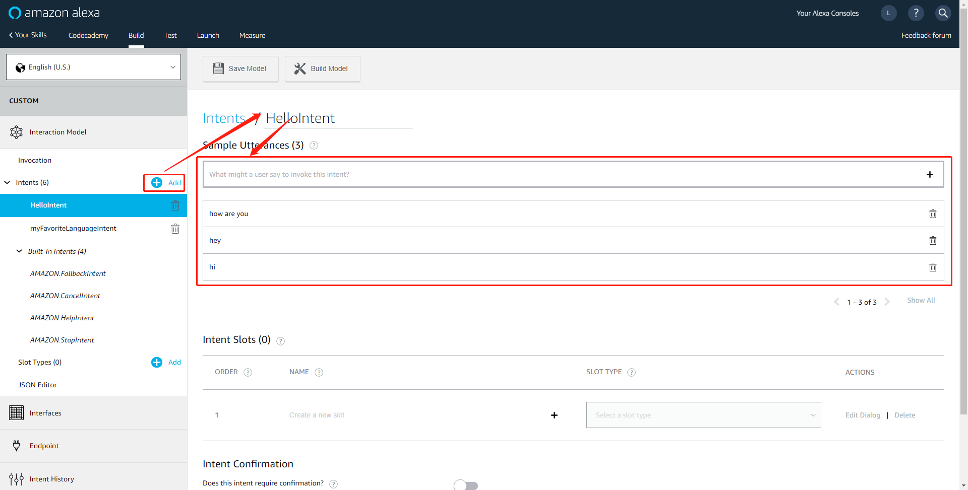 4.2、Intent中的Add 添加意图名字 -->Sample Utterances 示例语句 ——>Save Model ——>Build Model: