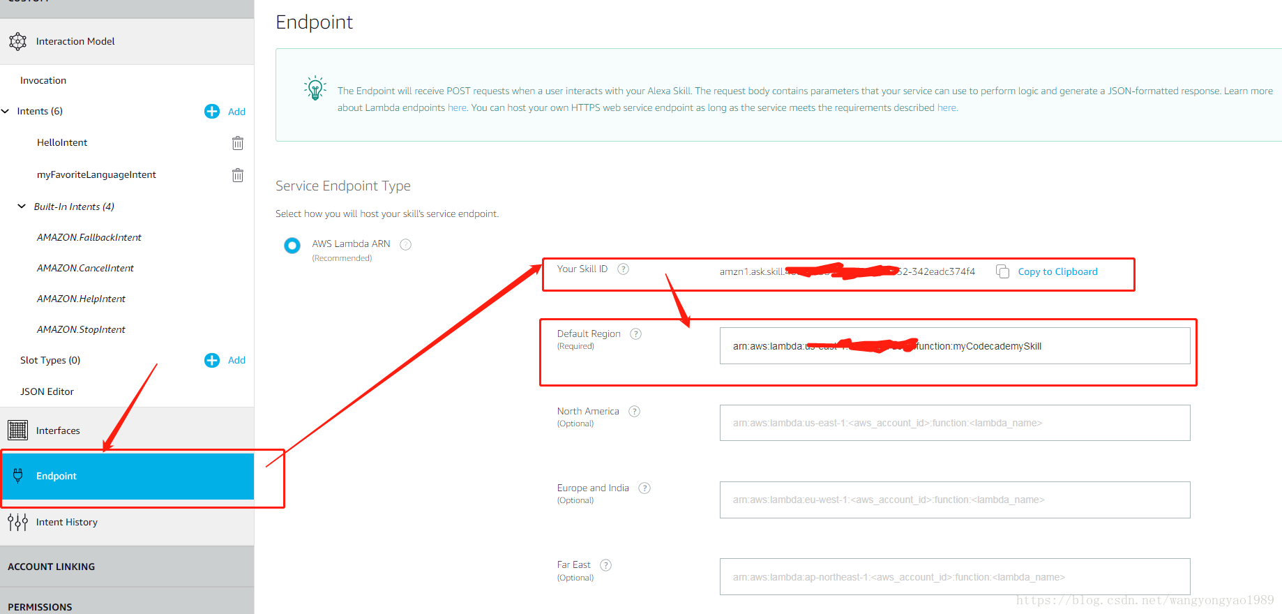 5.Endpoint中与lambda函数连接,“Your Sills ID”是创建技能的ID在之后Lambda函数要用到,“