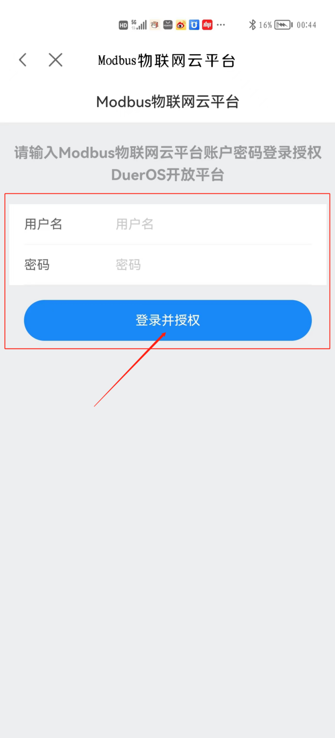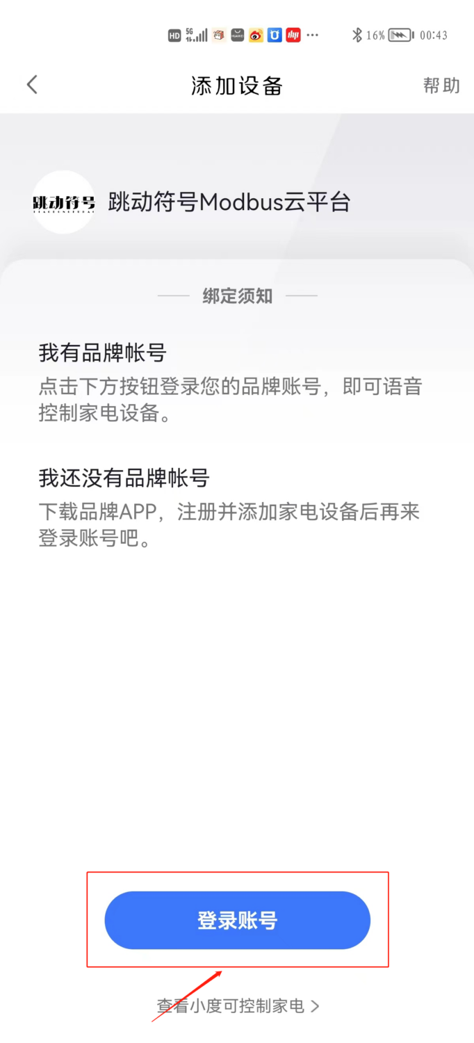 2、技能的账号授权。具体操作方法:登录小度APP,点击首页右上角的添加设备(+),搜索并进入“跳动符号Modbus云平台”技能,点击界面最下方的账号授权,在新界面中输入第2步中“Modbus云平台”网站的账号、密码登录,完成授权。