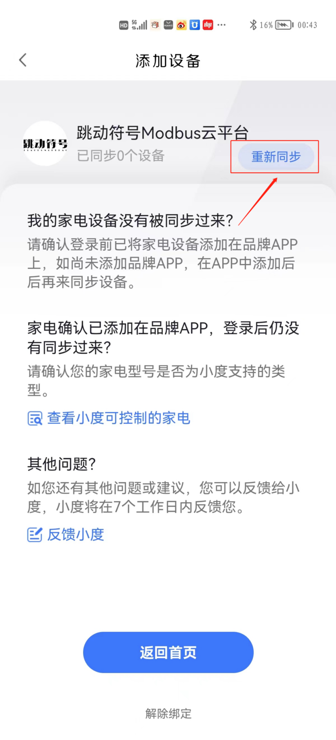 3、授权成功后,“Modbus云平台”网站中添加的设备将会出现在您的设备列表中,您可以通过语音来控制。你也可以对您的小度系列设备说“同步设备”来同步您的设备。