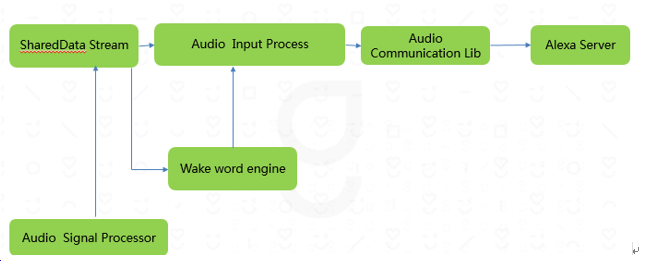 简单以SampleApp 数据流向说明一下,首先ASP 有一个线程在不断的从misc中采集数据,并且往SDS这个大buffer里去灌数据,于此同时了,唤醒词处理引擎(WWE),在不断的从SDS里去读取前面灌入的数据,当检测到唤醒词后,逻辑转入到AIP模块。AIP模块会根据WWE模块传入的参数,找到句子的开始与结束,然后通过计算,从SDS中获取正确的语音数据,然后组包通过ACL模块将数据,发送到AlexaServer 中去。