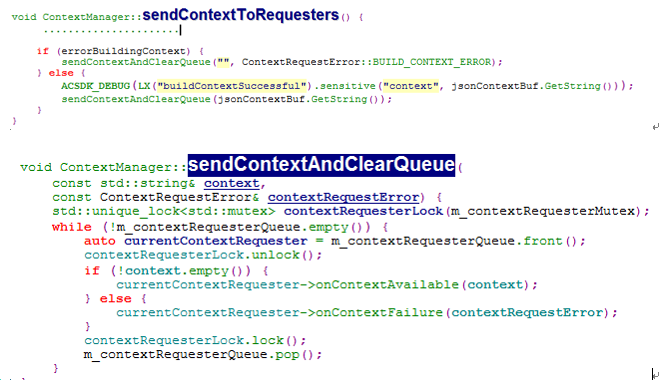 ContextManager,是上下文管理者,m_contextManager->getContext()触发m_contextRequesterQueue入队列操作,执行sendContextToRequesters,