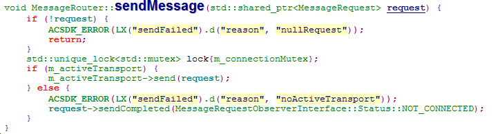 继续看sendRequestNow(),主要逻辑为m_messageSender->sendMessage(),这里的m_messageSender由SampleApplication::initialize()中创建的AVSConnectionManager对象。