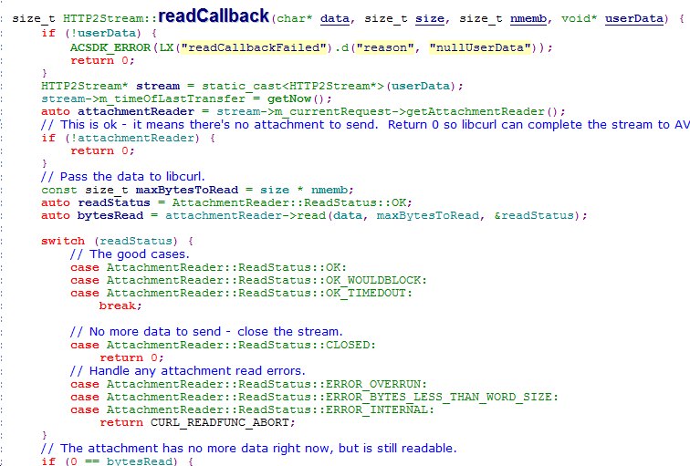 里面的attachmentReader是之前在AIP中构建的。调用它的read 的函数获取语音数据。
