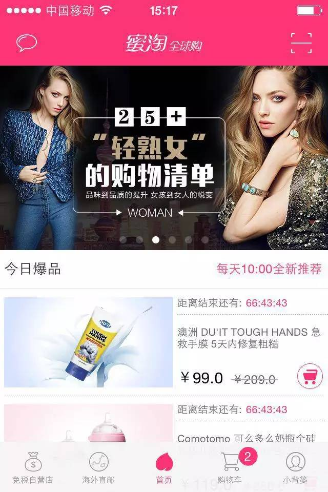 蜜淘的购物车功能最明显,底部一级导航tab可以直接查看购物车详情。