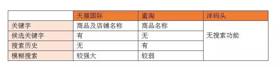 天猫国际的搜索功能更为丰富,候选关键字可以减少用户输入。蜜淘的搜索历史,考虑到海淘商品一般价格都不低,高价低频的消费,用户重复搜索的使用频率较高。通过搜索历史,用户可以直接选择,也有利于减少输入。洋码头不支持搜索功能,用户寻找商品花费时间成本最大