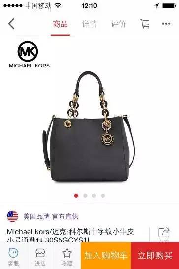 相比其他两个App,因为是自营+海外官网代下单的模式,最弱化商家信息。商品详情页的信息较丰富,注重突出商品的价格、折扣以及服务承诺。底部常用操作悬浮:个人中心、评论、购物车、客服。此处点击个人中心、购物车都会直接跳转到个人中心和购物车页面,而这种跳转可能会引起转化率流失。