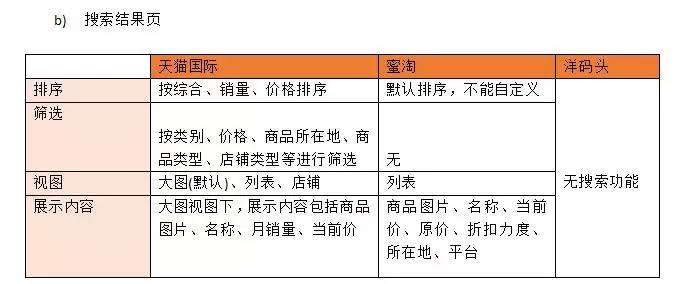 搜索结果页以天猫国际最为丰富,排序及筛选功能让用户更快找到商品。展示内容则以蜜淘更为丰富,特别是当前价、原价、折扣力度的展示,对价格敏感客户更能起到刺激作用