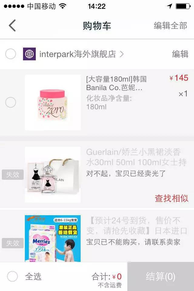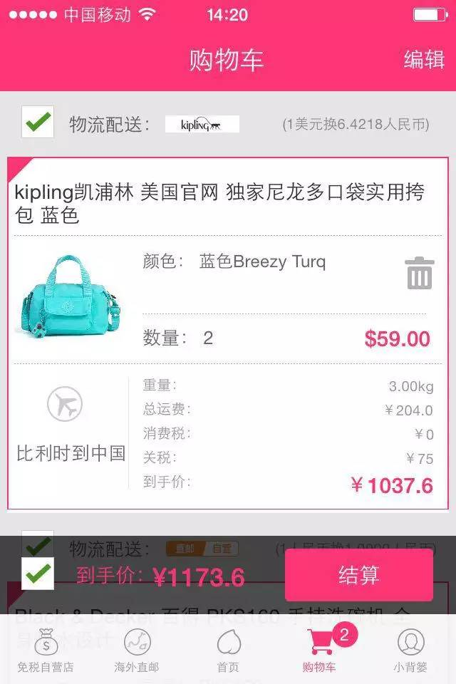 相比其他两个app,天猫国际的购物车详情功能较为强大,展示内容上带有明显的商家信息。