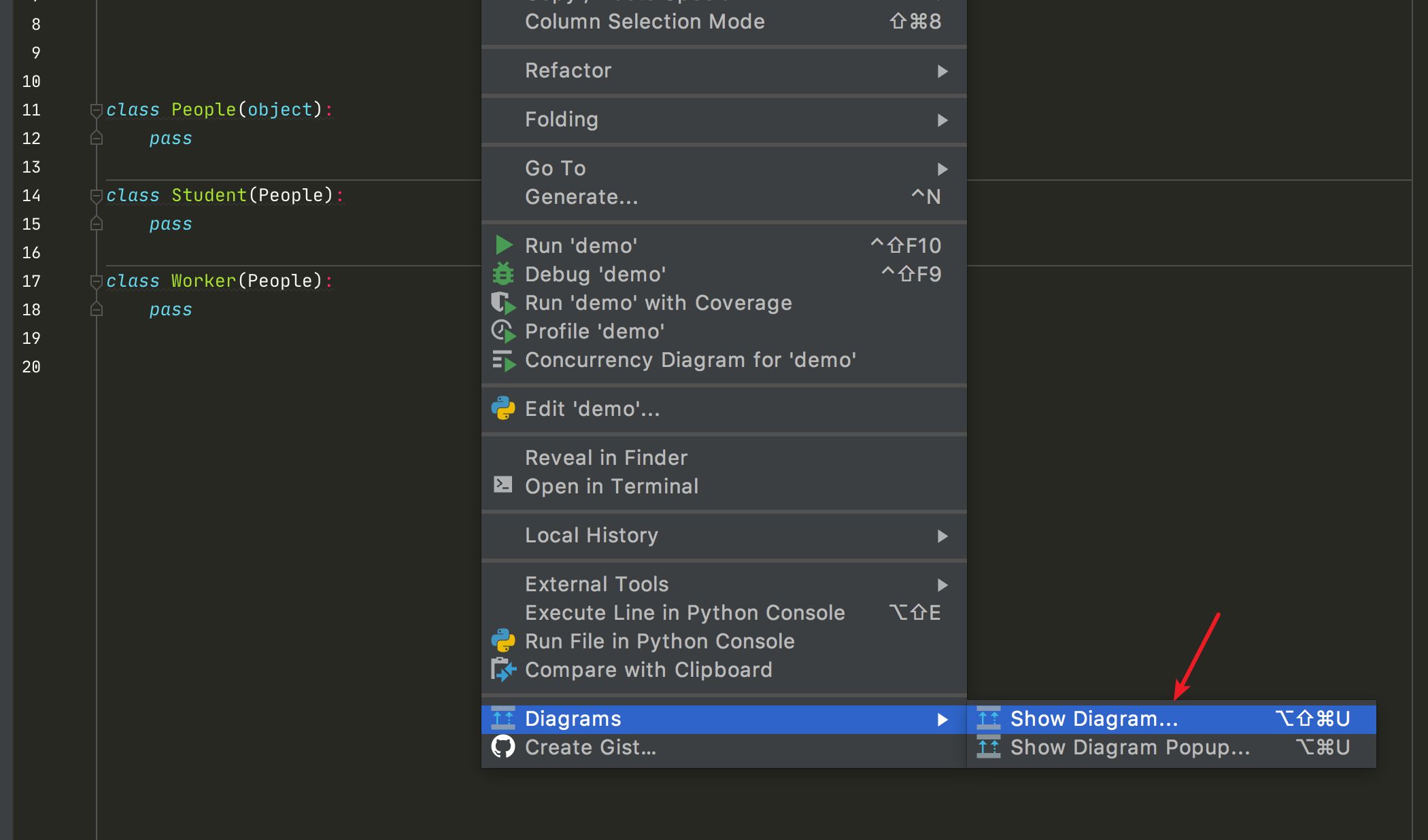 在你想查看继承关系的 类 中,右键选择 Diagrams -> Show Diagram