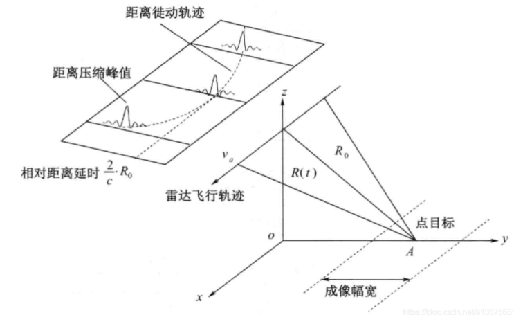 pr(t)为 窗函数Wt(ft)的傅里叶逆变换,对于矩形窗,pr(t)为sinc函数。我们可以认为脉压峰值对应的时刻就是回波时延,可以根据此来计算出目标的距离,但是雷达平台在运行过程中,与目标的距离是变化的,这就导致在对于同一目标,雷达不同慢时间时刻上,距离脉冲压缩后的峰值不在同一时刻。即距离压缩后得到的是含有距离徙动的瞬时斜距。