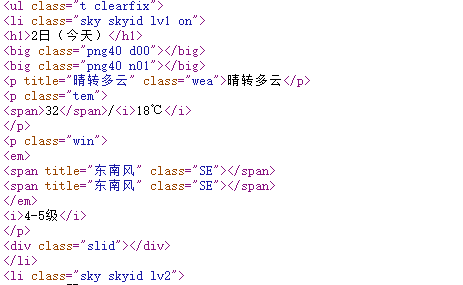 查看网页源代码:分析一天的天气标签 ul li h1 p span i win