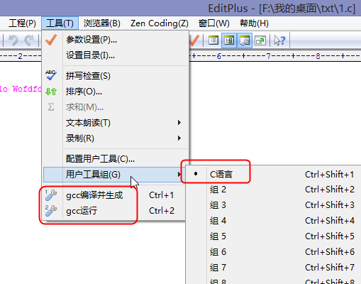 在Editplus-工具-用户工作组选择C语言则可以切换,便可以看到生成两个gcc工具