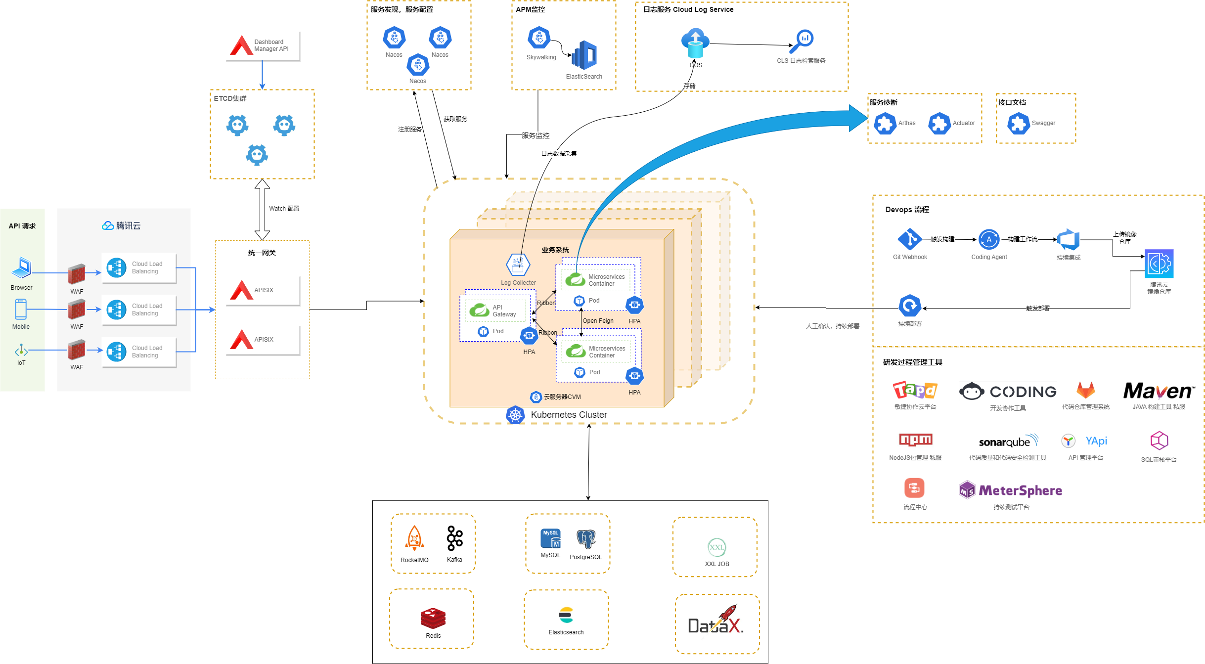 右侧是君润自研服务平台,DevOps 流程依托 Git webhook、coding、Kubernetes 集群实现全自动化与无感发布,业务系统基于 PaaS 平台进行迭代开发,确保研发规范,并达成技术栈的统一。上侧是监控手段,系统集成了 sky-agent 和 arthas,满足了线上服务观测多维度的需求。与此同时,采用腾讯日志云与 Kubernetes 结合的方式将服务日志存储在云上,实现 Kubernetes 集群内无文件化服务,避免磁盘容量堆积从而影响到 Kubernetes 集群单个节点的健康。