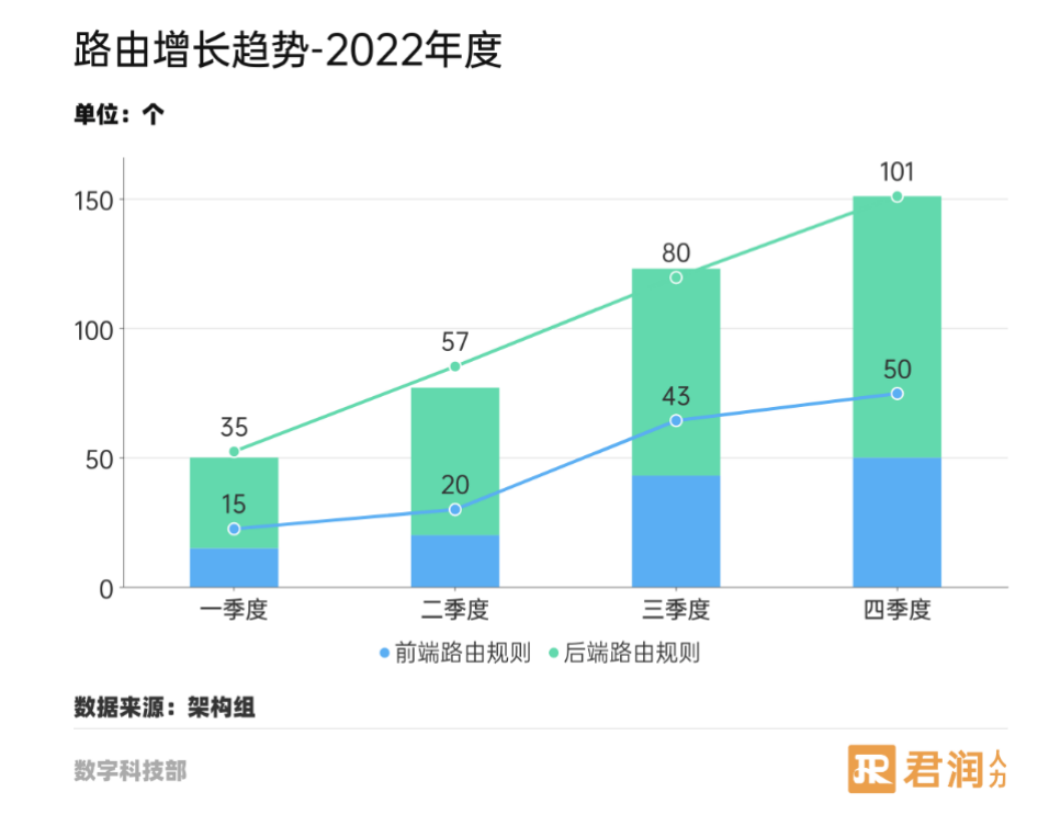 下图是君润人力 2022 年度路由增长趋势图。可以看到,不论前端还是后端路由,在引入 APISIX 之后,都实现了三倍或以上的数量增长。