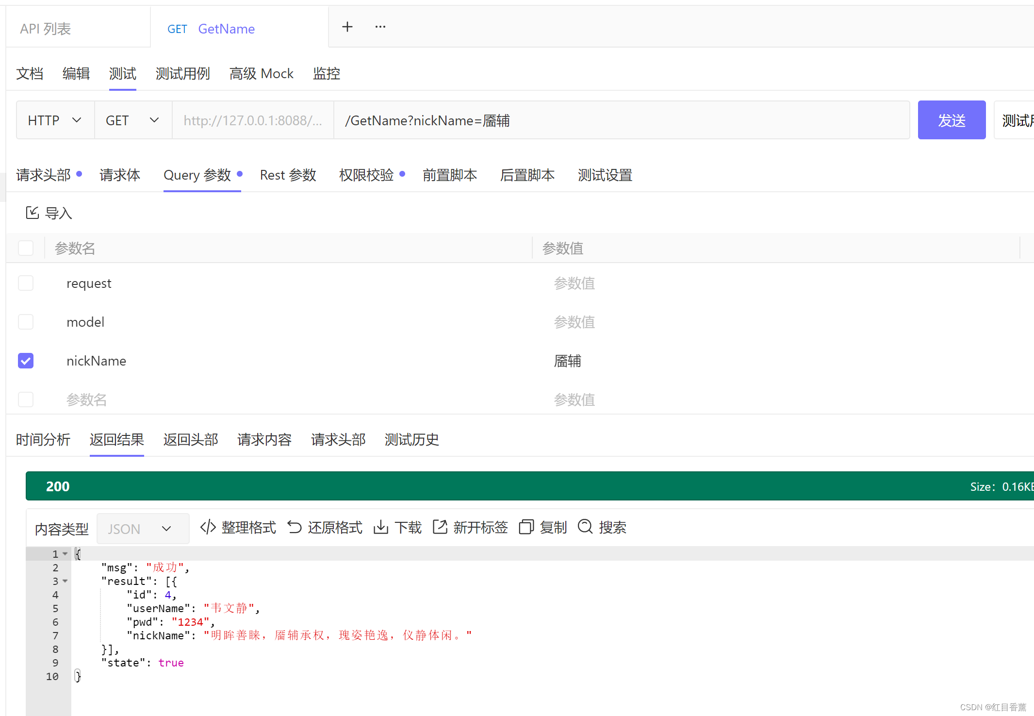 顾名思义,API接口需要的参数,我这里传递了个测试的参数。