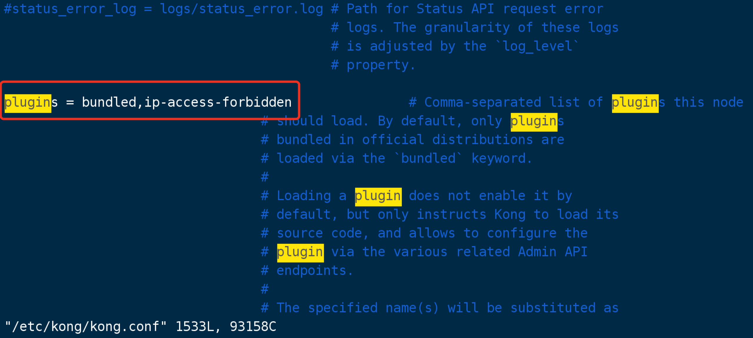 3.修改/etc/kong/kong.conf配置文件,加载ip-access-forbidden插件