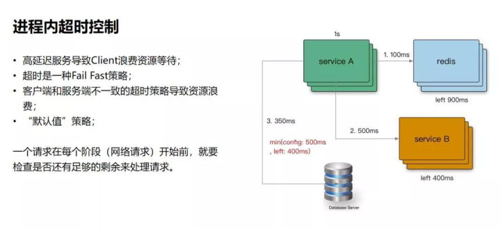 进程内的超时控制,关键要看一个请求在每个阶段(网络请求)开始前,检查是否还有足够的剩余来处理请求。另外,在进程内可能会有一些逻辑计算,我们通常认为这种时间比较少,所以一般不做控制。