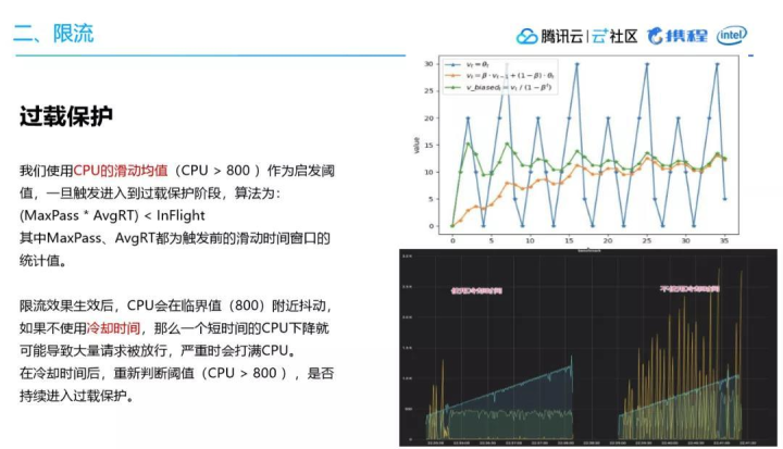 简单来说,当我们的CPU达到80%的时候,这个时候可以认为它接近过载,如果这个时候的吞吐达到100,瞬时值的请求是110,我就可以丢掉这10个流量,这种情况下服务就可以进行自保护,我们基于这样的思路最终实现了一个过载保护的算法。