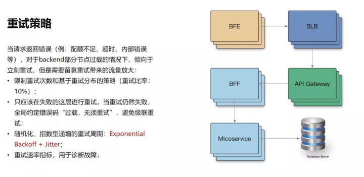 第三,在重试策略上,在微服务内尽可能做退避,尽可能要考虑到重试放大的流量倍数对下游的冲击。另外还要考虑在移动端用户用不了某个功能的情况下,通常会频繁刷新页面,这样产生的流量冲击,我们在移动端也要进行配合来做流控。