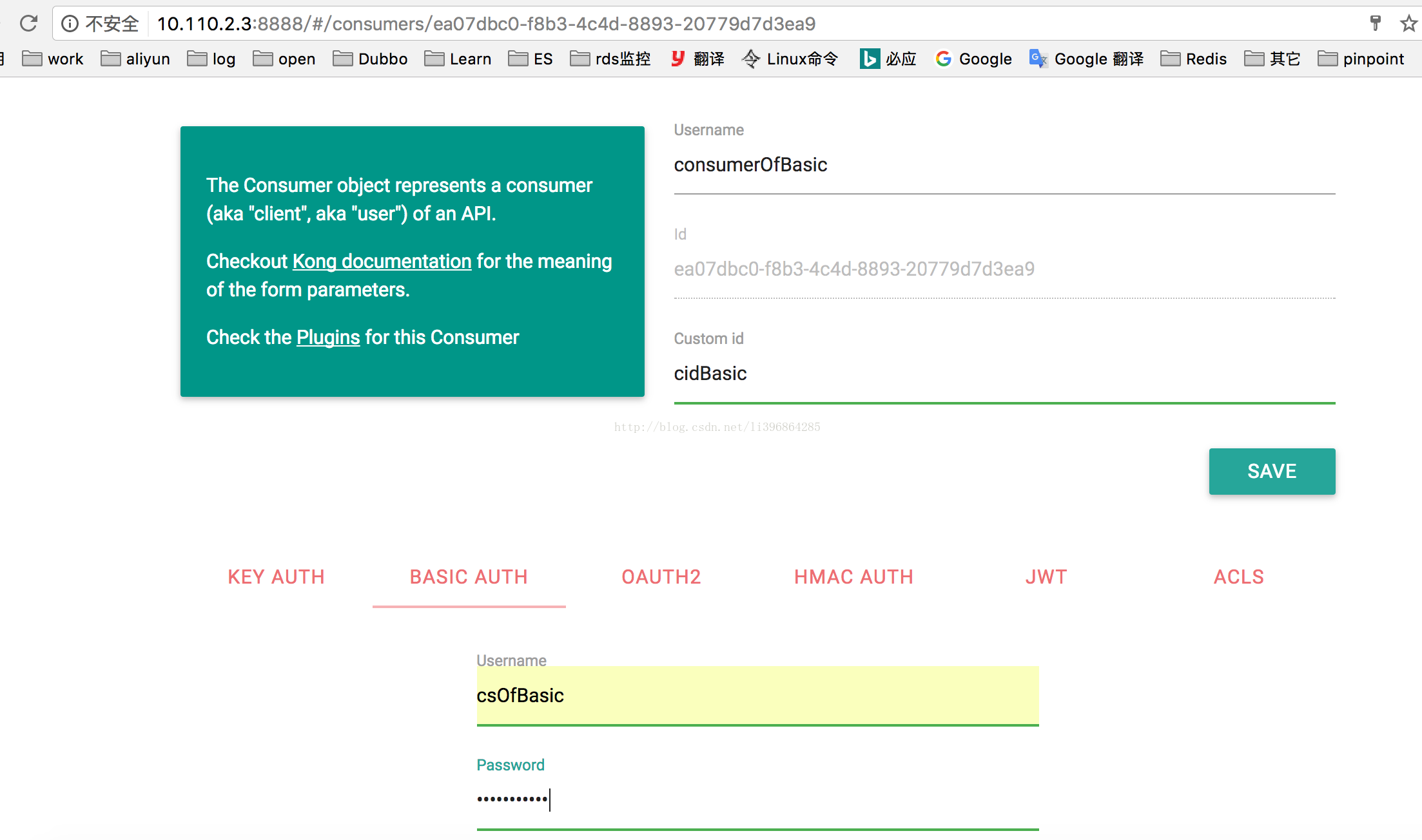 创建basic-auth用户和秘钥:username=csOfBasic,password=testkongpwd。注意,此处username和consumer username不是同一个,是username是用户的唯一公开用户名,basic-auth username则可以是多个。具体操作,如下图: