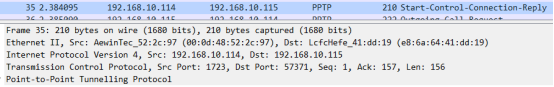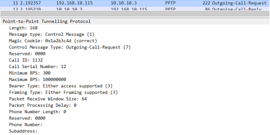 包11:由PPTP客户机发出,请求创建PPTP隧道,outgoing-call-request消息包含GRE报头中的Call ID,该ID可唯一地标识一条隧道。