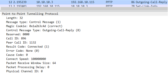 Peer Call ID:设置的值是从接收到的Outgoing-call-request中Call ID值,是由PPTP客户端指定的,用于GRE中对于隧道数据解封与复用。