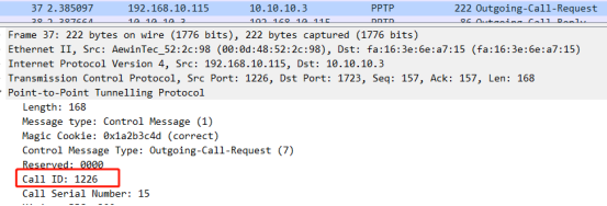 包36:客户端发送outgoing-call-request报文,请求建立PPTP隧道,并且携带自己的唯一标识(call id 20631)发送给服务器。