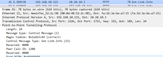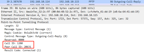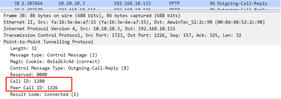 源端口:1723 目的端口:57371 call ID:1280 peer call ID:20631