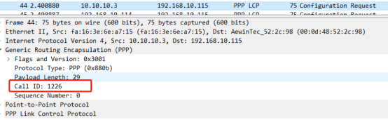 包44:向客户端发送PPP LCP报文,携带客户端的call id 1226