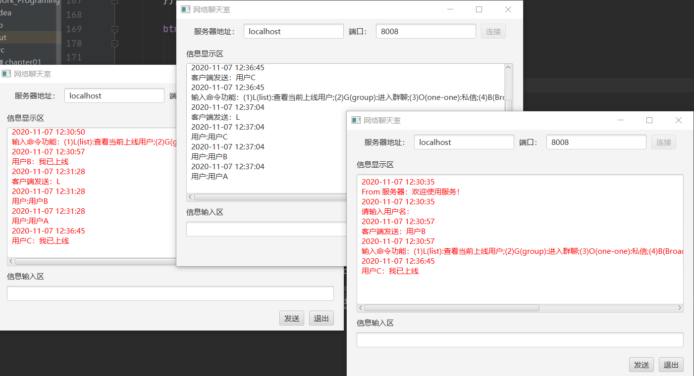 到此,基本实现了一个简单的客户端-服务器应用,因此,本篇将基于前面全部内容,使用客户端-服务器(C/S架构),结合多线程技术,模拟类似QQ、微信聊天功能,实现一个网络实时聊天室,目前的功能包括: