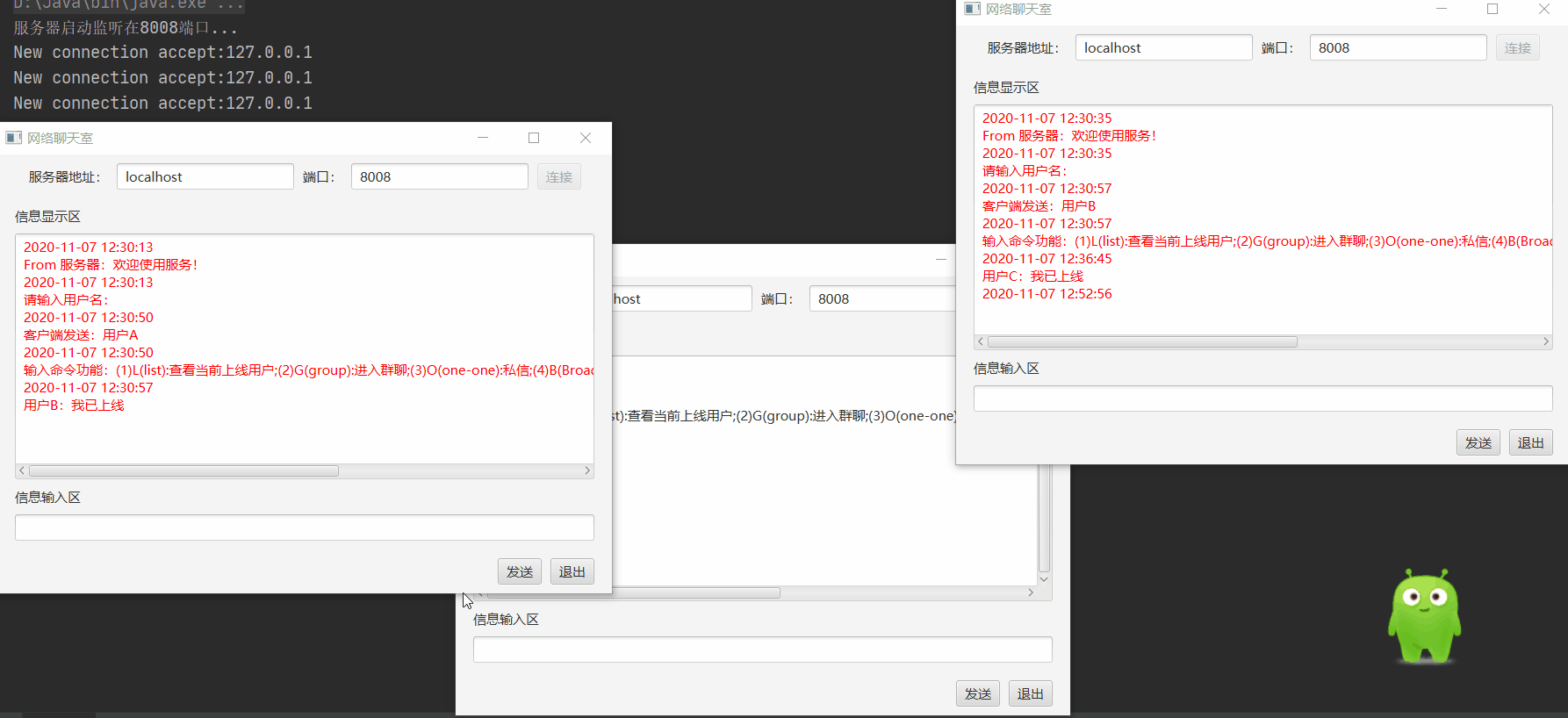 以上就是害怕玫瑰最近收集整理的关于Java进阶:基于TCP的网络实时聊天室(socket通信案例)开门见山一、数据结构Map二、保证线程安全三、群聊核心方法四、聊天室具体设计五、聊天室服务完整代码六、效果演示:基于TCP的网络实时聊天室结语的全部内容,更多相关Java进阶:基于TCP内容请搜索靠谱客的其他文章。