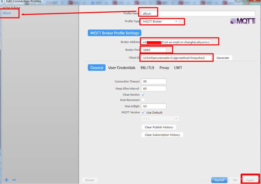 不过要想与阿里云物联网平台成功通信,需要对MQTT客户端进行设置,关键的有几个参数,比如Broker Address,Broker Port以及Client ID。其中Client ID是几个参数经过加密算法(阿里云平台的类型是hmacsha1)计算出来的。