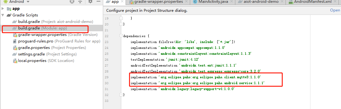 然后在工程build.gradle中,添加Paho仓库地址。请注意,添加paho仓库的同时,修改一下其他仓库的地址,因为阿里云提供的仓库速度更快。
