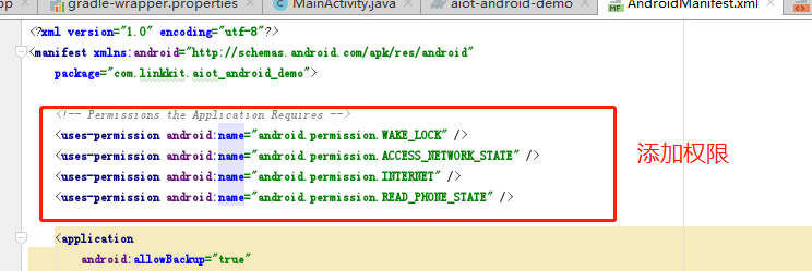 接下来开始连接物联网,在MainActivity里面添加三元组,主题以及客户端信息。