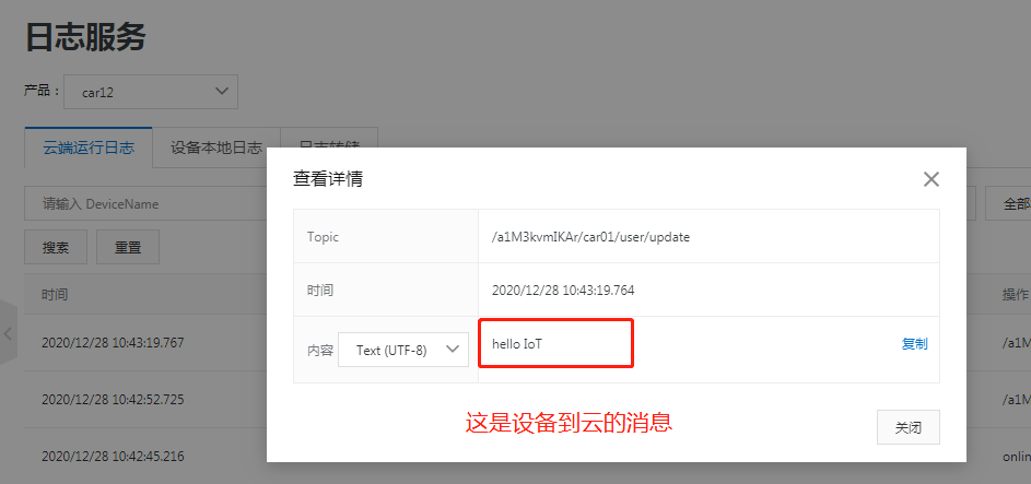 点击PUBULISH按钮,回到阿里云物联网平台下的日志里面查看,成功发布了消息。