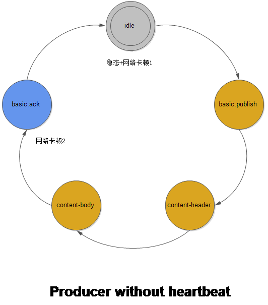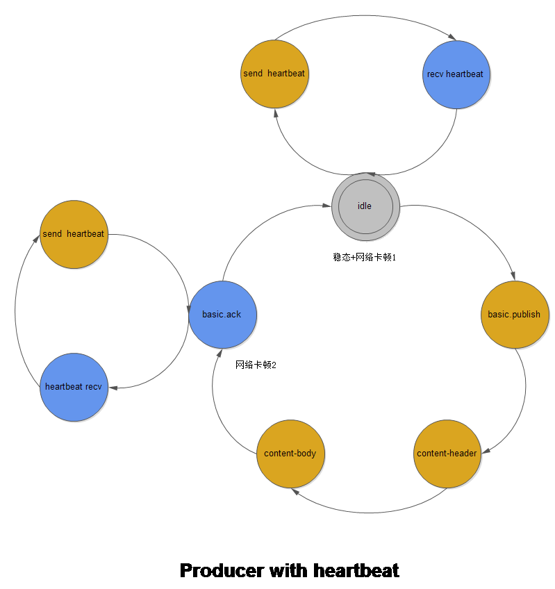 没有考虑 heartbeat 情况下,给出 rabbitmq Producer 状态转换时 FSM 的稳态以及可能出现网络卡顿的地方。