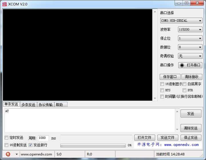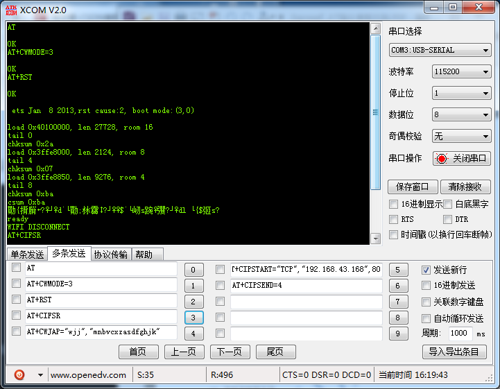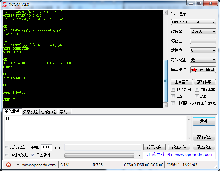 打开XCOM串口助手,并且手机开热点,接下来测试下面的AT指令