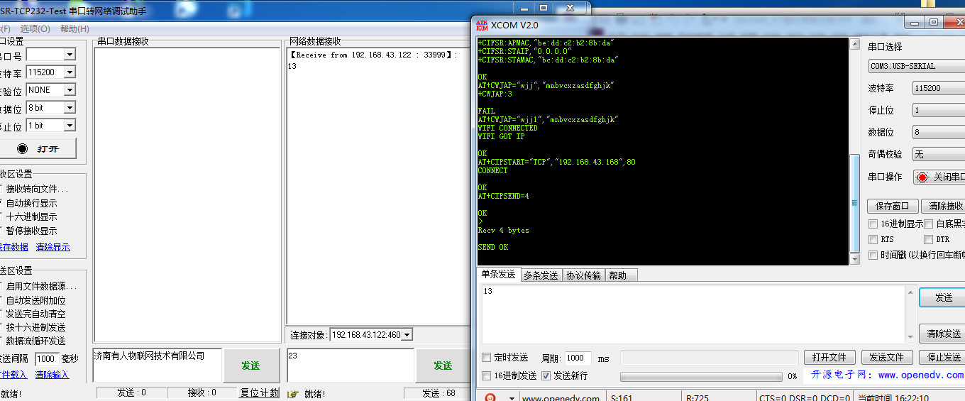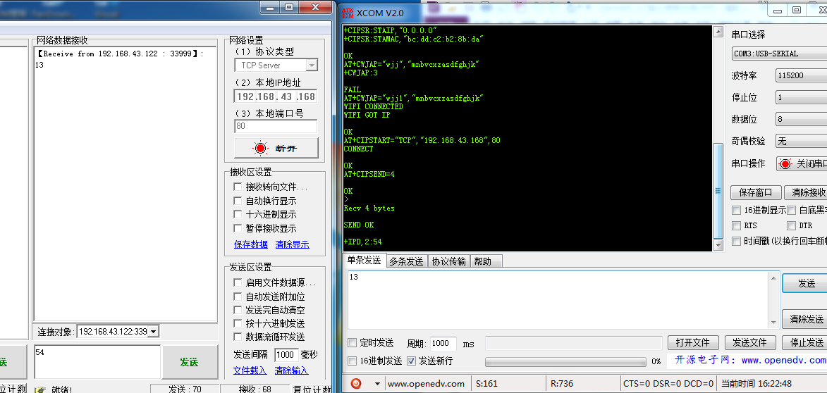 手机开热点,电脑连接wifi,打开网络调试助手,配置电脑为server,ip地址要注意,然后打开XCOM进行调试,结果如下图所示
