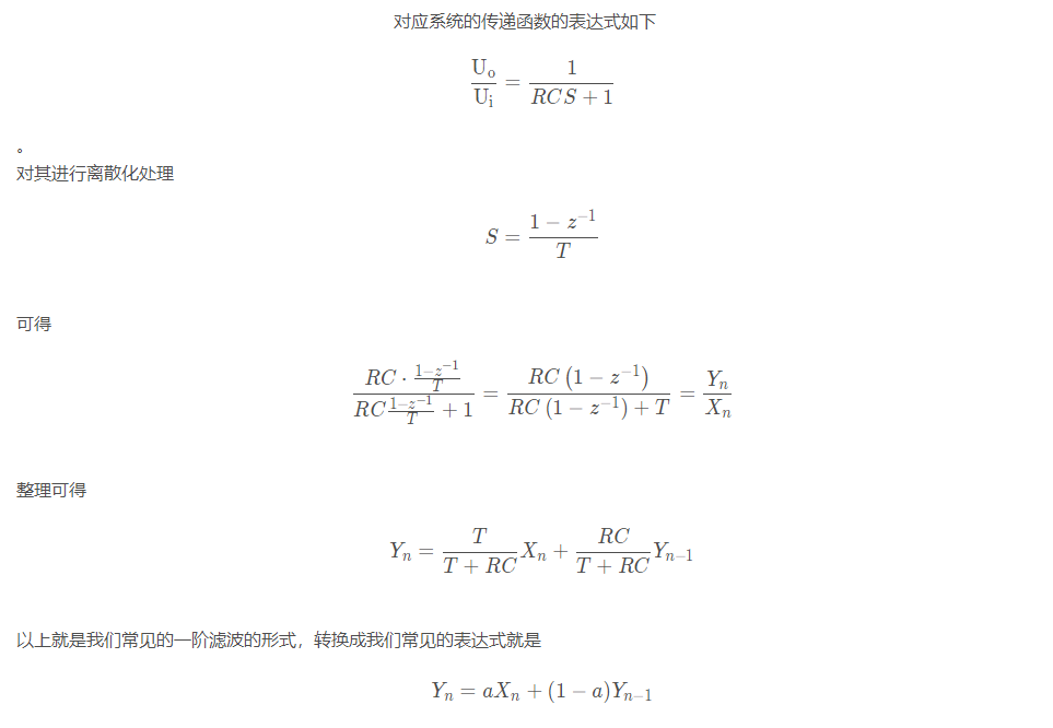 原理:一阶数字低通滤波器和一阶硬件滤波器是功能一致的,把RC滤波的电路函数进行离散化后就得到数字滤波器的表达式原型,为什么使用数字滤波器,因为这个通过软件来实现,设计灵活性高,成本低