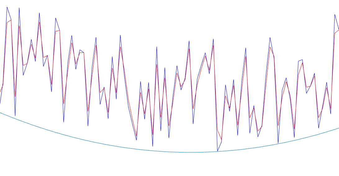 滤波系数α=0.8,蓝色是输入的噪声信号,红色是滤波后的信号